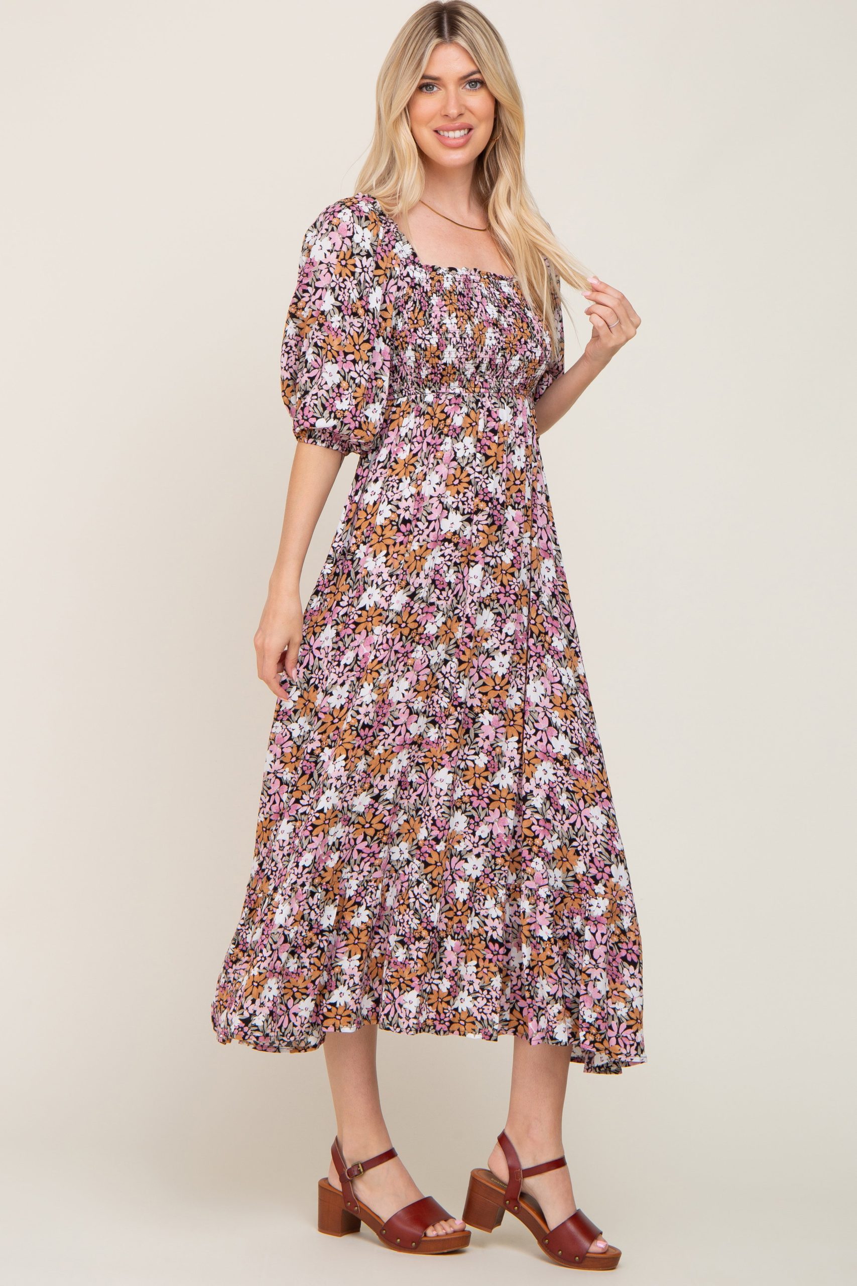 Details A multi-color floral maxi dress featuring short puff sleeves, a smocked top, a back self-tie belt, a ruffle hem and a square neckline. Content + Care