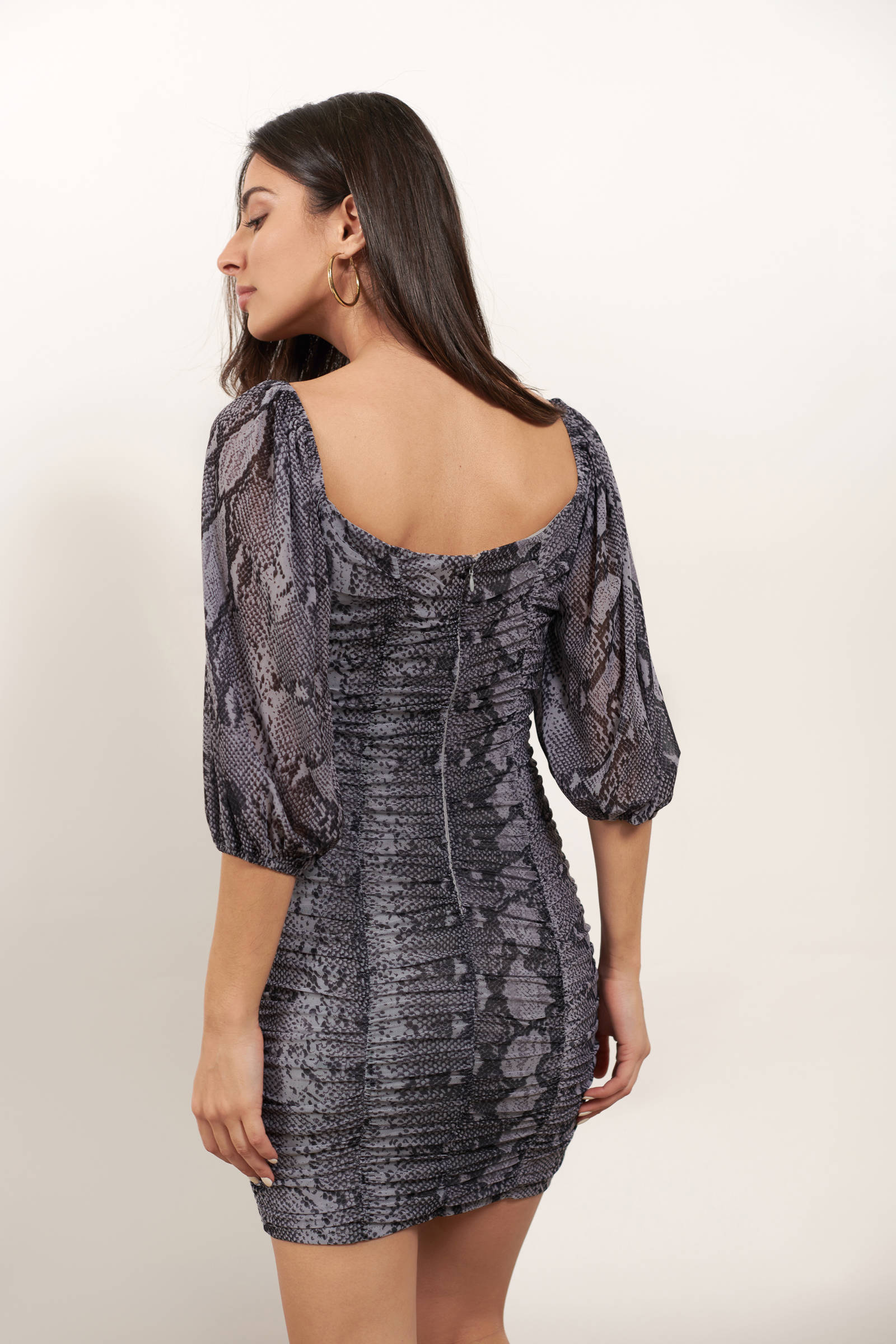 Strike a pose in the First Hiss Snake Print Balloon Sleeve Mini Dress in Grey! This mini marvel features a slinky bodycon fit with a snake-printed mesh shell and ruched details that hug your curves just right. Elastic trim at the shoulders and sleeve hems adds a fun flair, while the lined bodice and back zipper keep you comfortably chic. With its bold print and playful sleeves, this dress is perfect for turning heads and making a statement wherever you go!