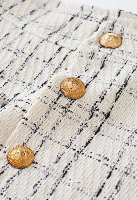 Check this stunning skorts into your wardrobe to bulk up your collection of vintage-inspired closet staples that you can mix and match with endless pieces. The flap at front design and golden thread trimming add just the right amount of sultry detail, featuring the grid print and the front metal buttons.
