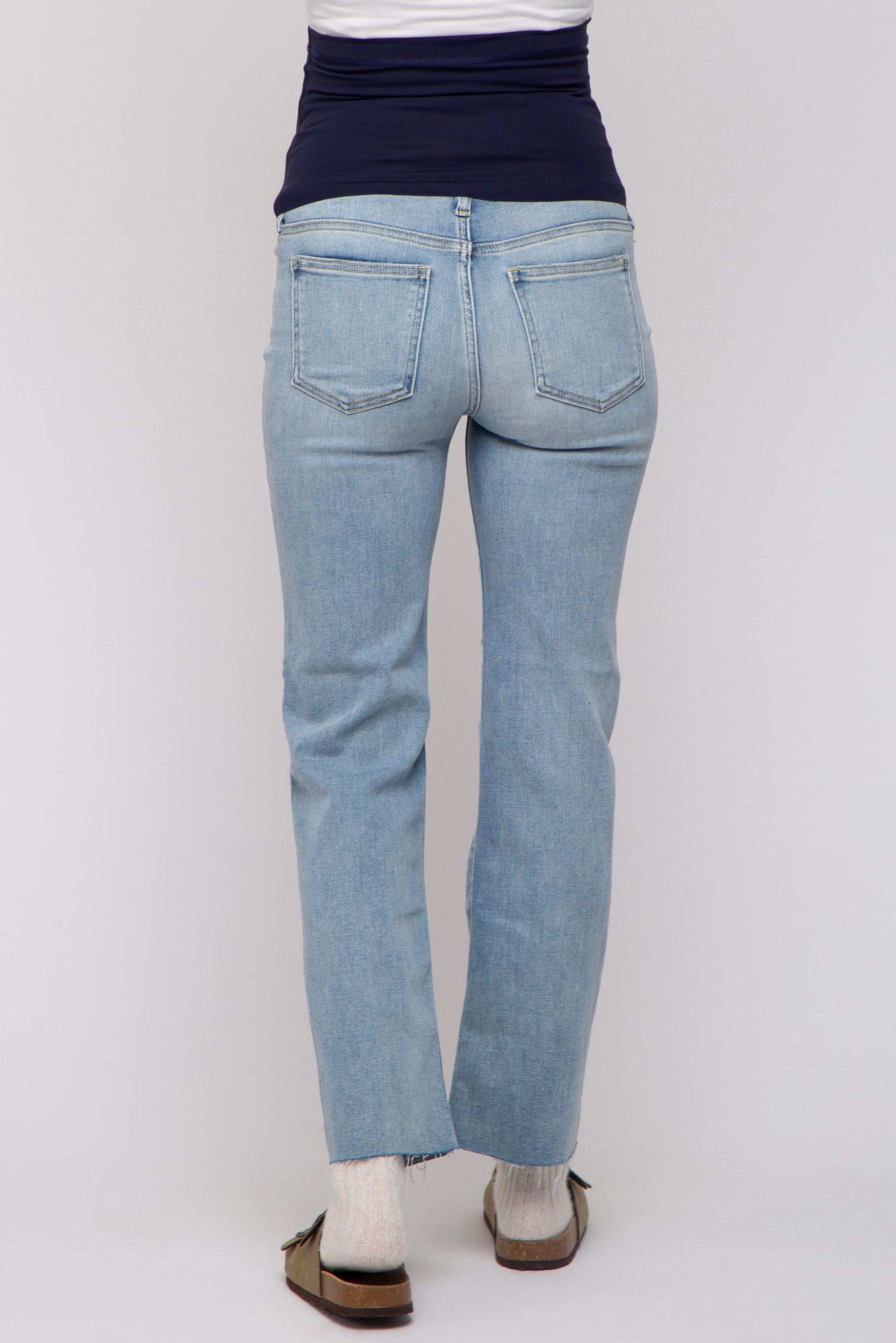 Details A pair of light washed maternity jeans with 5 pockets, distressed knees, an elastic belly band, and a raw hem. Content + Care