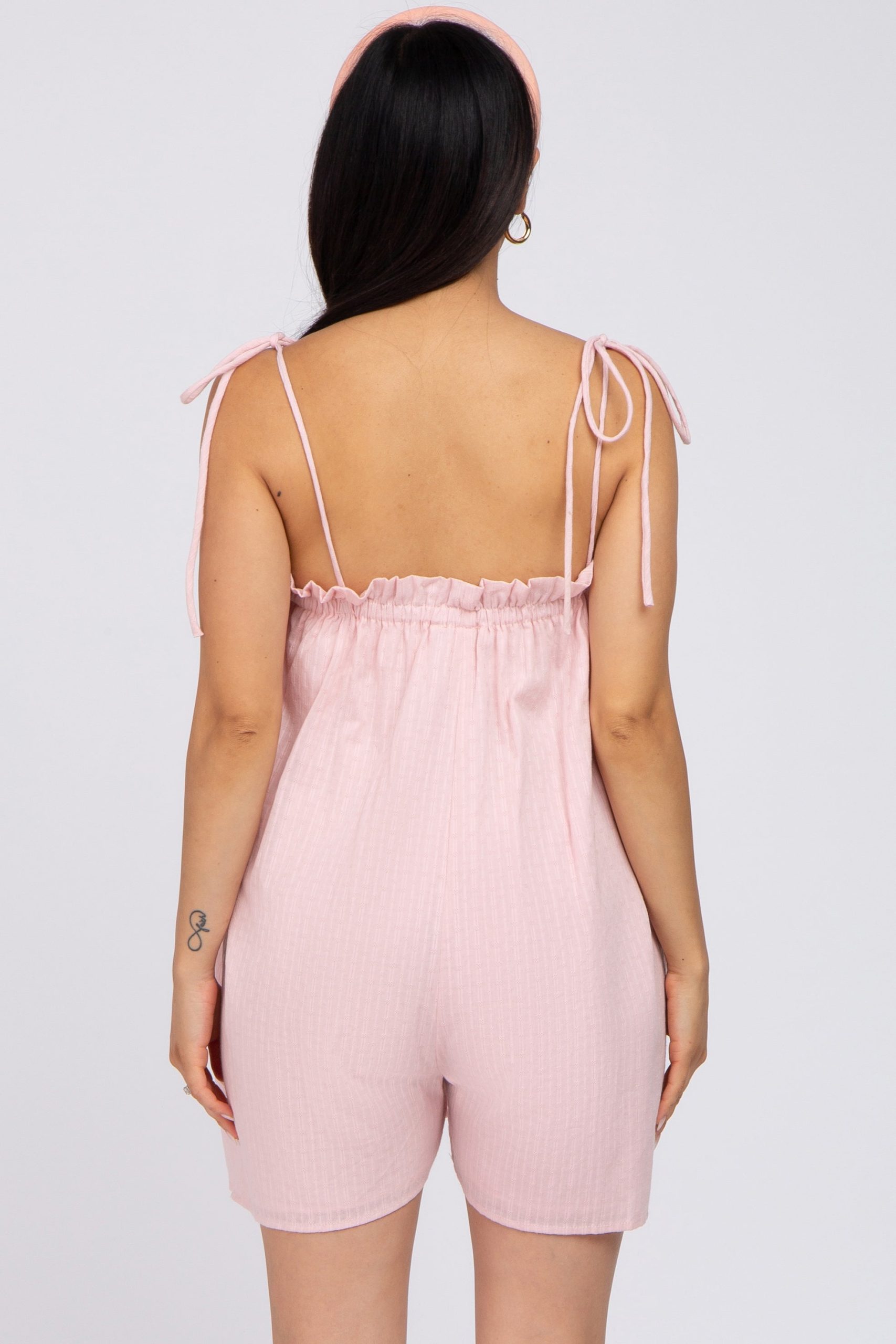 Details A square textured maternity romper featuring adjustable string shoulder ties, a squared ruffle trim neckline, side pockets and double lined. Content + Care