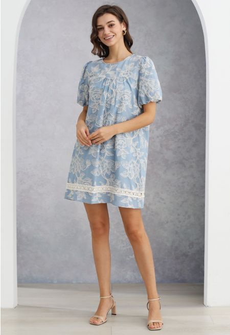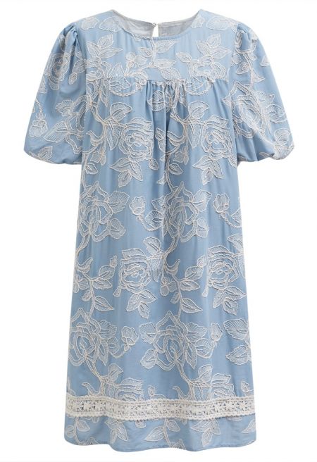 This dress is a stunning blend of elegance and charm. It features intricate floral embroidery, enhanced with a touch of sequins for a subtle shimmer. The elastic cuffs create a comfortable fit, while the crochet decor at the hem adds a delicate, feminine detail. Perfect for special occasions, this dress combines style and sophistication effortlessly.